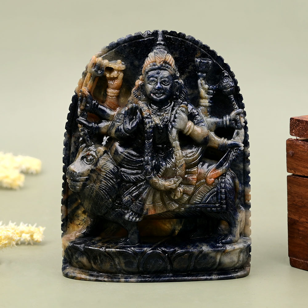 Devi Durga, the Divine Mother, is crafted with dexterity from a single piece of natural Blue Sapphire gemstone. The allure of Maa Durga has been beautifully illustrated in this idol with fine carving and embossed paintwork. The attention to minute details like fine coloring of hair strands in gold and facial attributes in a realistic manner reflects the sincere effort and diligence of the craftsman. Blue Sapphire promotes wisdom, the power of discretion, discipline, growth, and pacifies the negative effects of the planet Saturn.