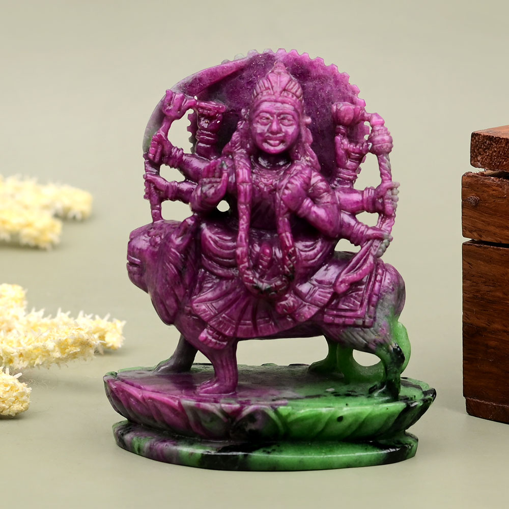 A very finely carved idol of Goddess Durga in natural Ruby gemstone is ideal to be placed as it is in your altar. The sword, trident, bow and arrow, mace, lotus, conch and Chakra held in her upper arms symbolize eradication of vices, courage, righteousness, devotion, detachment, happiness, and good conduct. Ruby enhances the blessings of Goddess Durga and promotes additional energies of fame, name, leadership, motivation, passion and power.