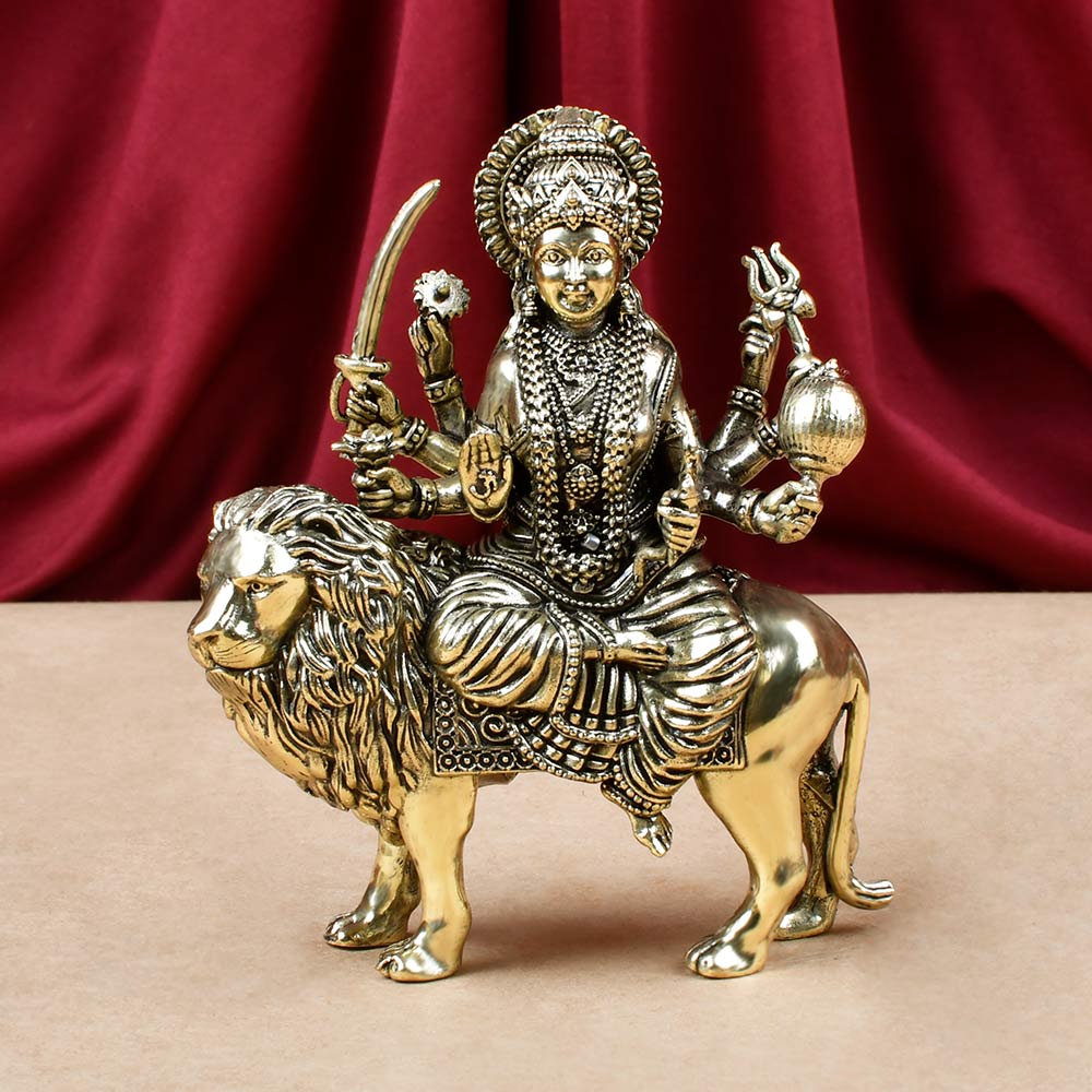 This finely detailed idol portrays Goddess Durga seated gracefully on a lion, holding a sword, lotus, trident, conch, and other divine symbols in her hands. Crafted from Ashtadhatu, a sacred alloy of eight metals—gold, silver, copper, lead, zinc, tin, iron, and mercury—this idol embodies the traditional art and energy of Hindu worship. (Note: Gold and silver are present in trace amounts.) The antique polish and intricate craftsmanship highlight the divine aura and regal expression of the Devi.