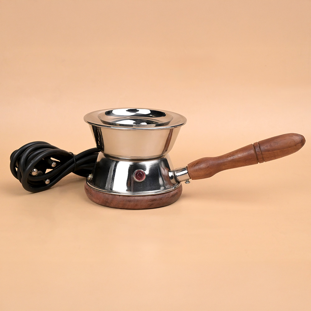 This burner comes with an accommodating space at top for keeping incense cakes. Running on electricity, this burner is made with steel and safe wooden handle as well as base.