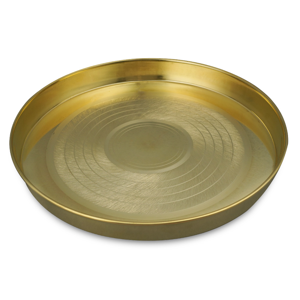 This Puja Thali is elegant with minimalistic design on it and made of shiny Brass. Brass is widely used for puja items in India. This Brass puja thali has elevated sides with slight curve outside, making it convenient to hold the thali, especially while performing 'aarti'. The elevated sides have stripe-like design etched on it and the outer edge of the side has medium size round design.