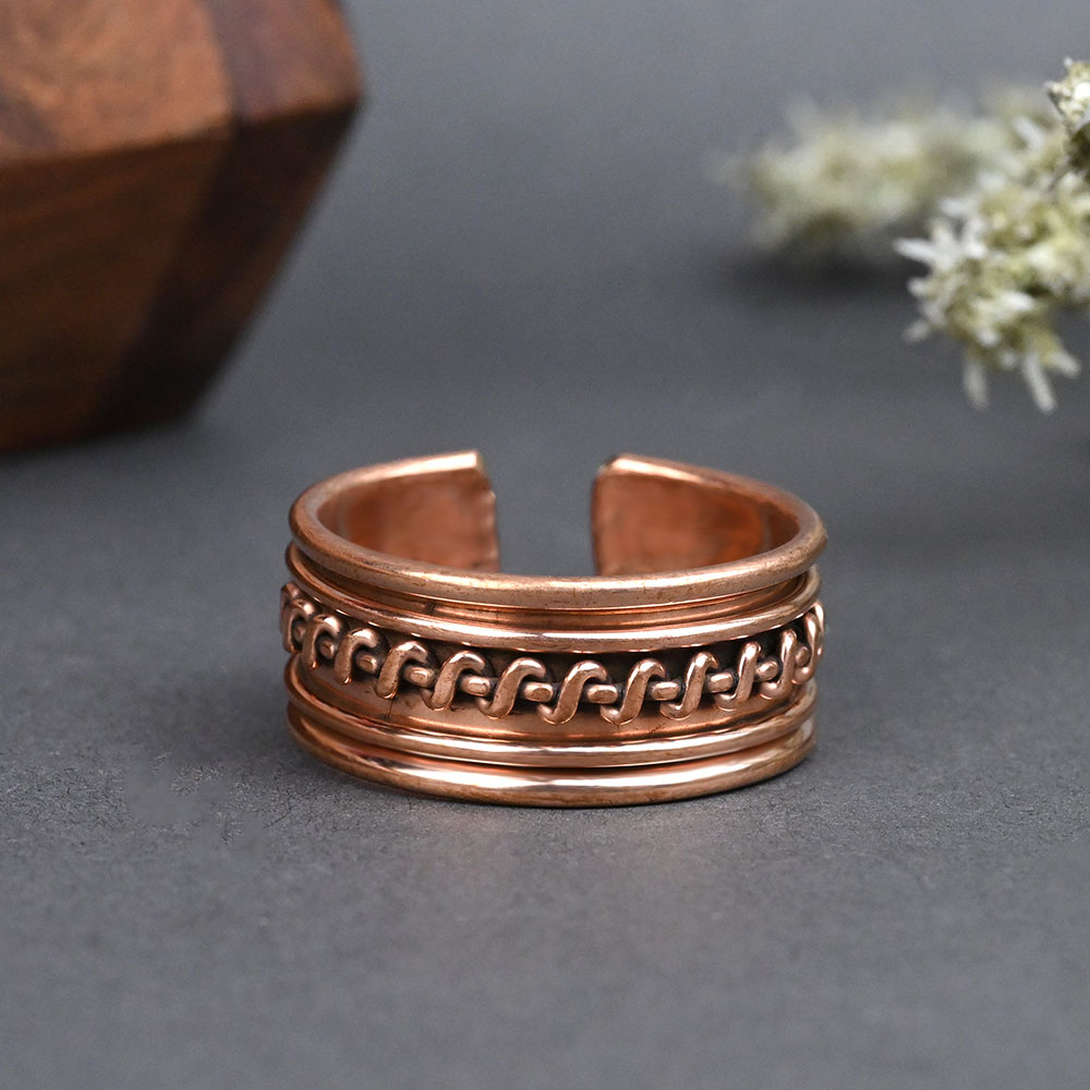 This stylishly designed pure copper ring with adjustable feature is sure to elevate your style quotient. Featuring entwined pattern of copper, the ring adds a touch of sophistication to your look. With high polish adding a shine, the adjustable ring would go well with both casual and formal wears. Copper being known for its healing benefits helps improve immunity and regulate blood circulation of the wearer. It helps reduce joint pain and prevents bacterial attack. Astrologically, it is beneficial to avert the ill effects of weakly placed Mars or Sun in natal chart.