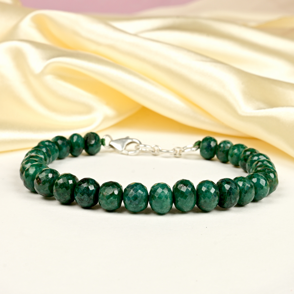 This luxurious Emerald Faceted Beads Bracelet is exquisitely crafted with finely cut natural Emerald stones, each radiating a rich green brilliance, and finished with a 925 sterling silver clasp. The faceted design amplifies the gem’s natural sparkle and depth, creating an aura of elegance and regal sophistication.