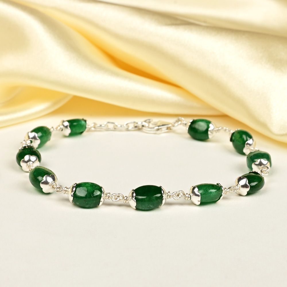 Bracelet made of oval emerald beads encased in silver flower caps. The emerald gemstone is cherished for attracting prosperity, awakening intuition, and nurturing emotional balance. Stylish and meaningful, this bracelet is perfect for daily wear, meditation, or as a timeless symbol of harmony and growth.