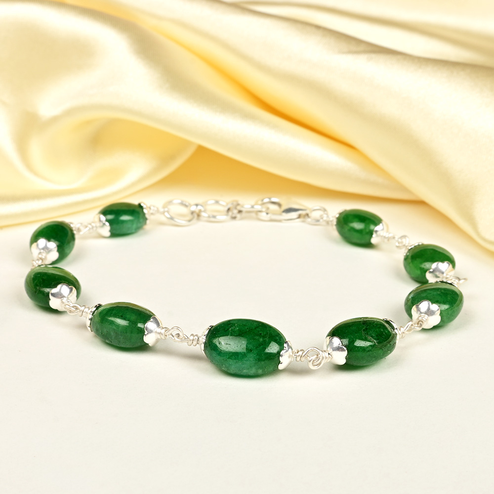 Bracelet made of oval emerald beads encased in silver flower caps. The emerald gemstone is cherished for attracting prosperity, awakening intuition, and nurturing emotional balance. Stylish and meaningful, this bracelet is perfect for daily wear, meditation, or as a timeless symbol of harmony and growth.