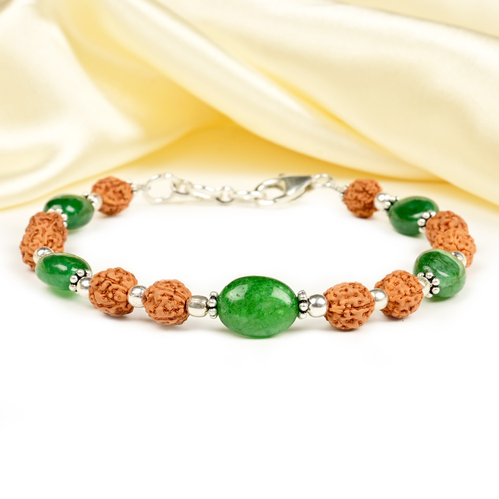Bracelet made of emerald beads and 5 mukhi rudraksha beads separated with silver balls and adorned with silver chakri spacers. Emerald attracts prosperity, fosters emotional balance, and sharpens clarity of thought, while Rudraksha beads bring protection, peace, and spiritual strength. Together they create a bracelet that is both stylish and deeply uplifting.