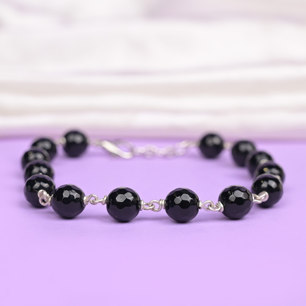 This Faceted Black Jade Bracelet features glossy black beads with fine facets that reflect light beautifully. Each bead is linked with 925 silver wire, giving the bracelet a clean and structured look. The secure clasp ensures a comfortable fit for regular wear.