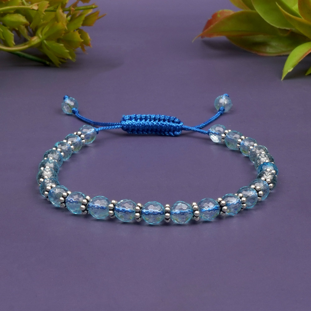 This eye-catching bracelet features beautifully faceted Blue Topaz beads, each separated with delicate silver chakri spacers, and strung on a vivid blue adjustable thread. The shimmering blue beads sparkle with clarity and elegance, while the silver accents add a refined finish. The adjustable closure ensures a perfect fit for all wrist sizes, making it both stylish and functional. Benefits: Enhances clarity of thought, boosts communication, soothes emotions, aids self-expression, and supports spiritual growth.