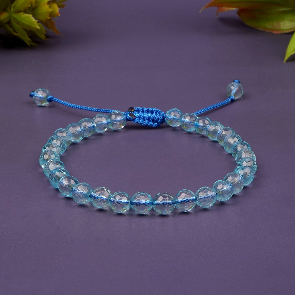 This elegant bracelet features sparkling faceted Blue Topaz beads, strung on a vibrant blue adjustable thread for a perfect and comfortable fit. The beads display a clear, soothing blue hue that reflects light beautifully, enhancing the bracelet's serene and refined appearance. The adjustable thread ends are finished with matching Blue Topaz beads for a seamless look. Benefits: Promotes emotional balance, enhances communication, supports throat chakra, calms the mind, and encourages truth and self-expression.