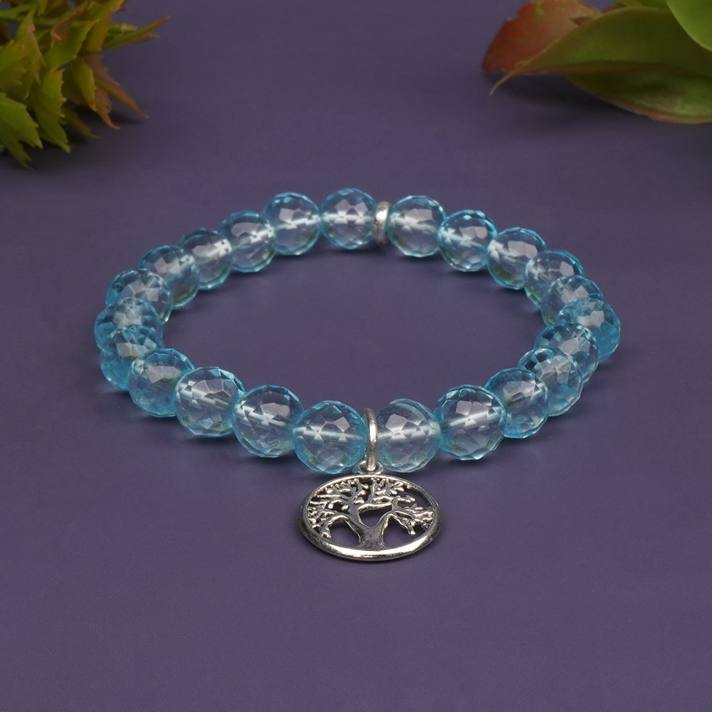 This graceful bracelet features faceted Blue Topaz beads strung together with a beautifully crafted Tree of Life charm, symbolizing growth, wisdom, and connection. The serene blue tones of the Topaz, combined with the silver-finished trinket, make this piece both meaningful and visually soothing. Benefits Brings clarity, calmness, and emotional healing. Encourages self-expression, spiritual growth, and inner strength.