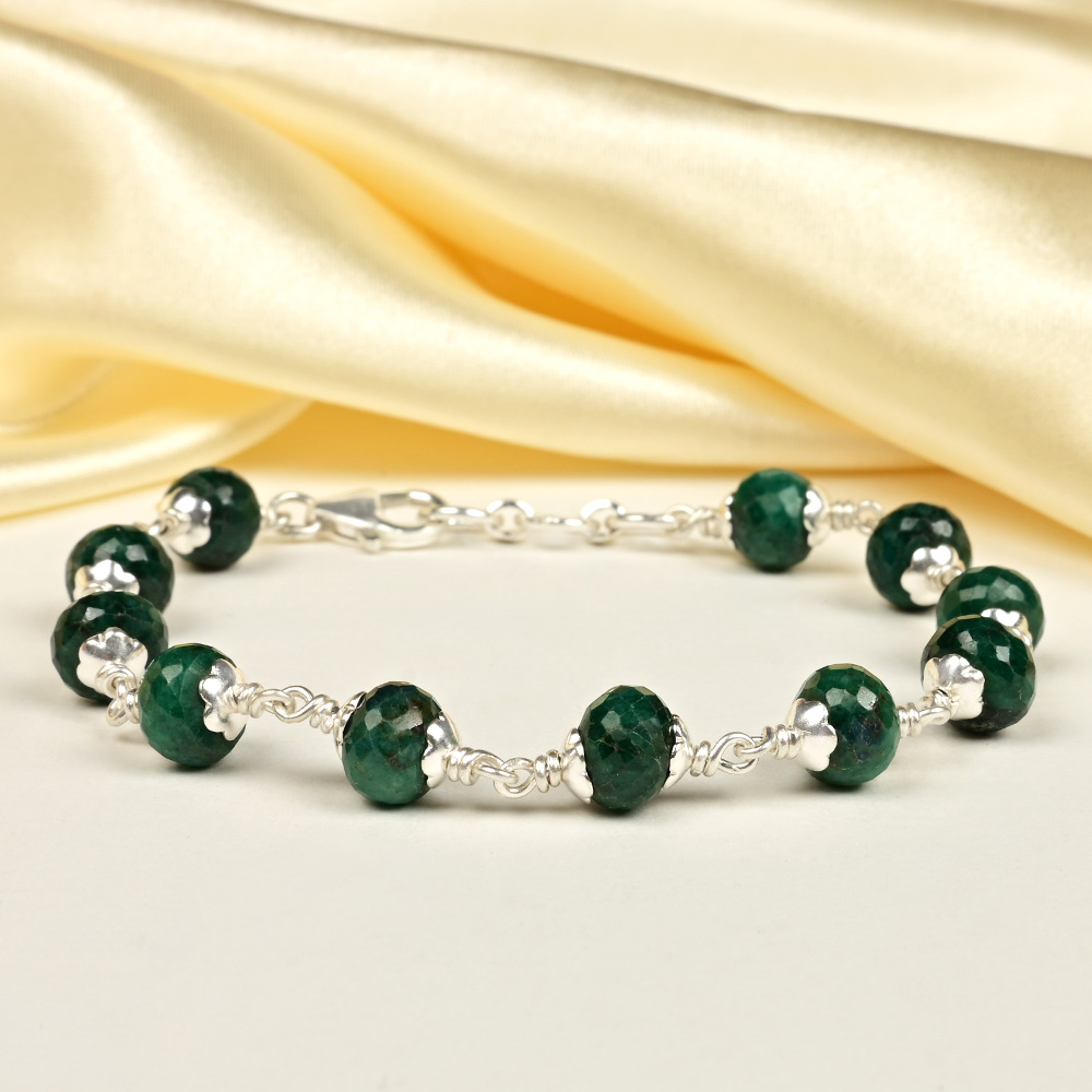 Bracelet made of faceted emerald beads encased in silver flower caps. The emerald gemstone is cherished for attracting prosperity, awakening intuition, and nurturing emotional balance. Stylish and meaningful, this bracelet is perfect for daily wear, meditation, or as a timeless symbol of harmony and growth.