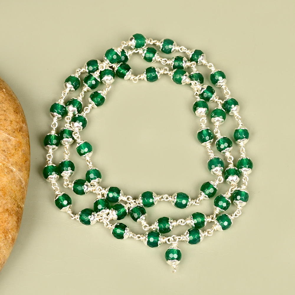 This mala features finely faceted green onyx beads, each secured between delicate 925 sterling silver flower caps and linked with matching silver wire, enhancing their rich green sparkle. The faceting catches the light from every angle, adding a refined brilliance to its spiritual charm.