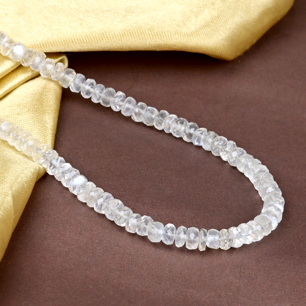 This Faceted Moonstone Button Beads Necklace features small button-shaped beads in a soft translucent white tone with natural sheen and subtle flashes characteristic of moonstone. The faceted surface adds gentle light reflection, enhancing the stone’s natural glow. The beads are strung in a uniform pattern and finished with a secure silver clasp and adjustable links for comfortable wear. The design is minimal and refined, making it suitable for both everyday use and special occasions.