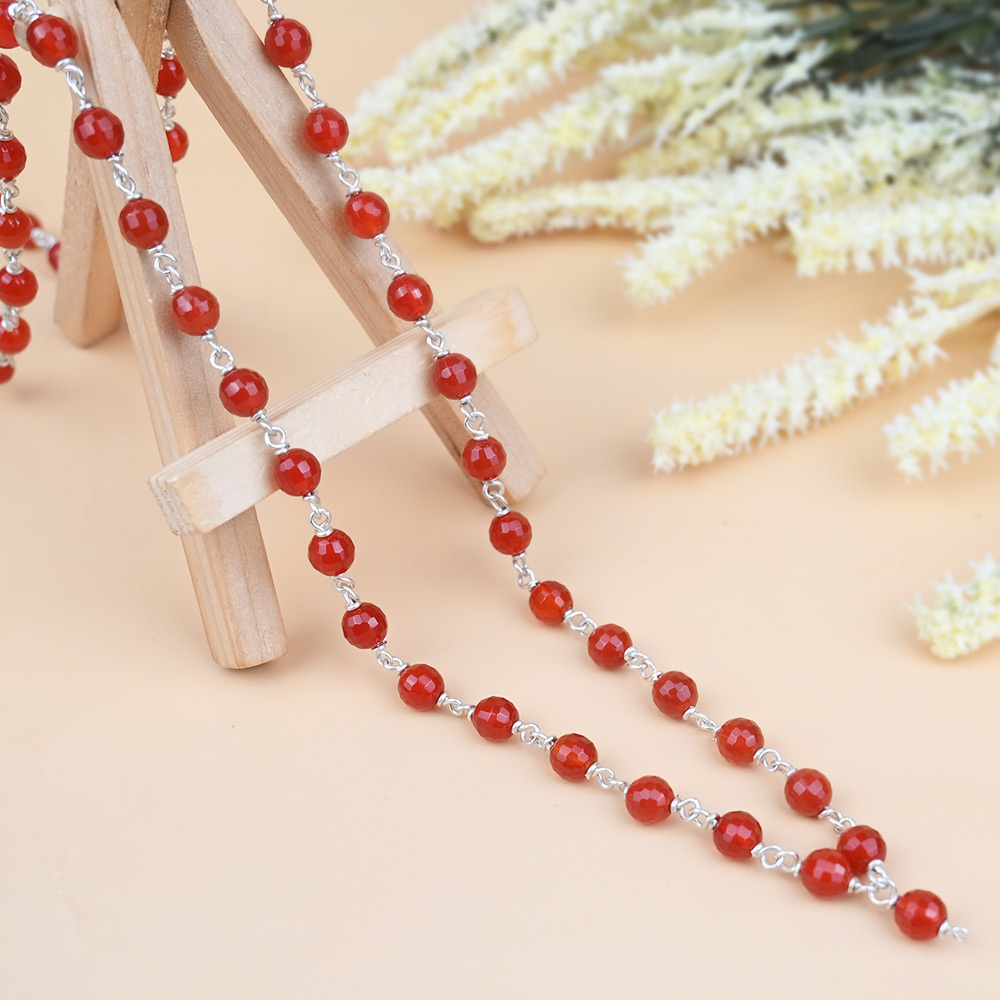 This exquisite Faceted Red Carnelian Mala is crafted with high-quality faceted Carnelian beads, elegantly encased in 925 sterling silver flower caps for a refined and luxurious finish. The faceted beads reflect light beautifully, enhancing the mala's radiance and charm. Each bead is meticulously connected with silver wire links, ensuring flexibility and durability. The intricate silver flower caps add a touch of divine elegance, making this mala a perfect blend of spirituality and style. Ideal for meditation, mantra chanting, or wearing as a statement accessory, this mala exudes both energy and sophistication. Benefits of the Faceted Red Carnelian Mala: Boosts confidence, motivation, and inner strength. Enhances creativity, passion, and artistic expression. Stimulates the Root and Sacral Chakras, promoting vitality and grounding. Aids in overcoming fears, self-doubt, and procrastination. Encourages emotional balance, courage, and determination.