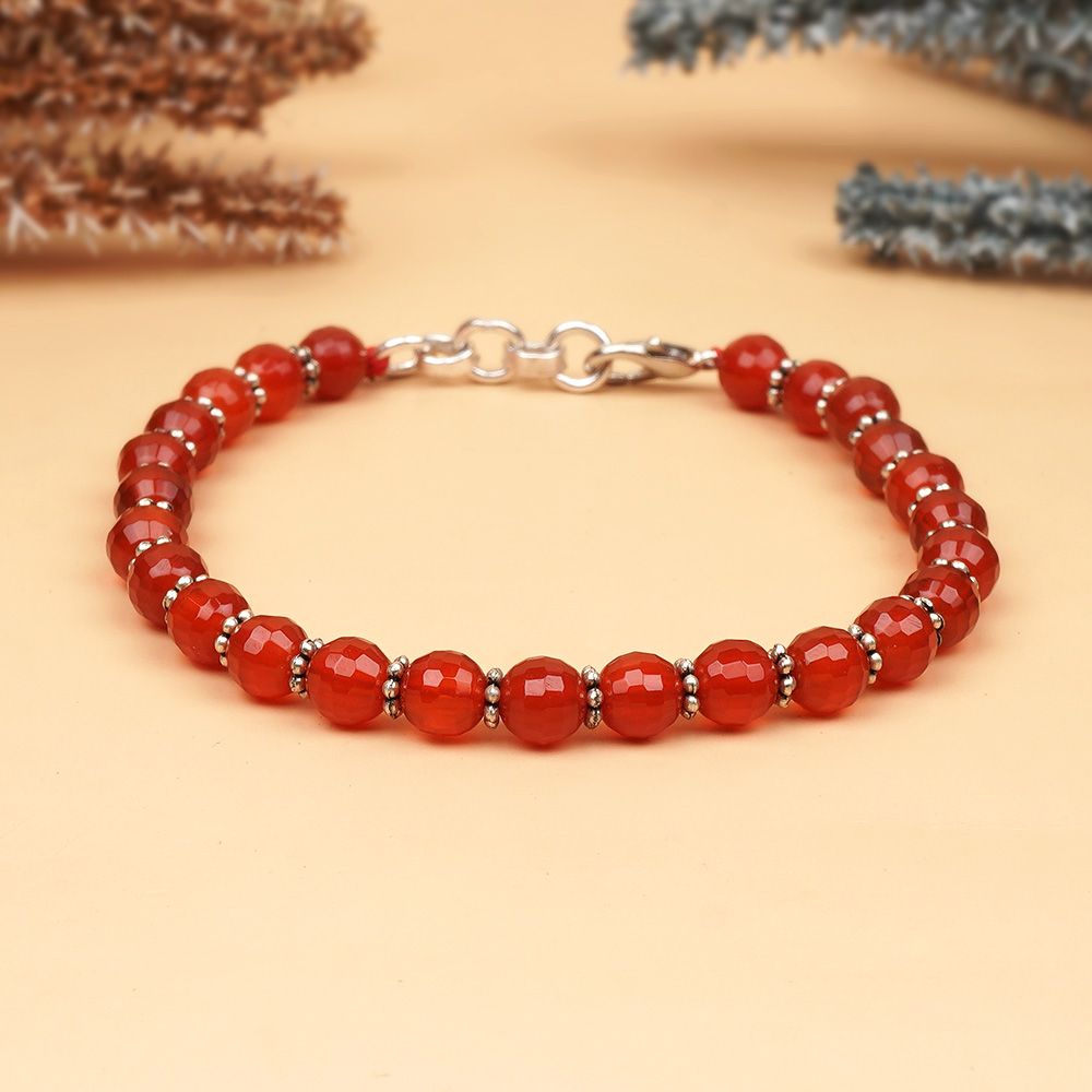 This bracelet features lustrous faceted Red Carnelian round beads, each separated by detailed German Silver chakri spacers that add a bold, ornamental touch. The combination of radiant gemstone sparkle and metallic detailing creates a rich, traditional aesthetic, secured with a sturdy lobster clasp. Spiritually, Carnelian is associated with the Root Chakra and is linked to the energy of Mars in Vedic astrology. It stimulates vitality, courage, and creative drive, making it a powerful ally for those seeking motivation and grounded action. Benefits: Boosts confidence and willpower, awakens creativity, grounds scattered energy, and protects against fear and lethargy.