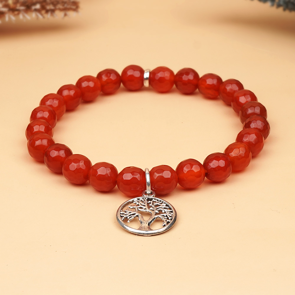 This bracelet features shimmering faceted Red Carnelian round beads, strung on a stretchable thread and highlighted with a detailed Tree of Life charm in a silver tone. A single metallic accent bead enhances the bracelet's elegance, complementing the rich orange-red hue of the stones. The Tree of Life represents grounding, growth, and connection to all life, while Red Carnelian, associated with Mars, the Root Chakra, ignites strength, confidence, and emotional stability. Benefits: Inspires inner strength and growth, enhances creativity and courage, grounds emotional energy, and protects against negativity.