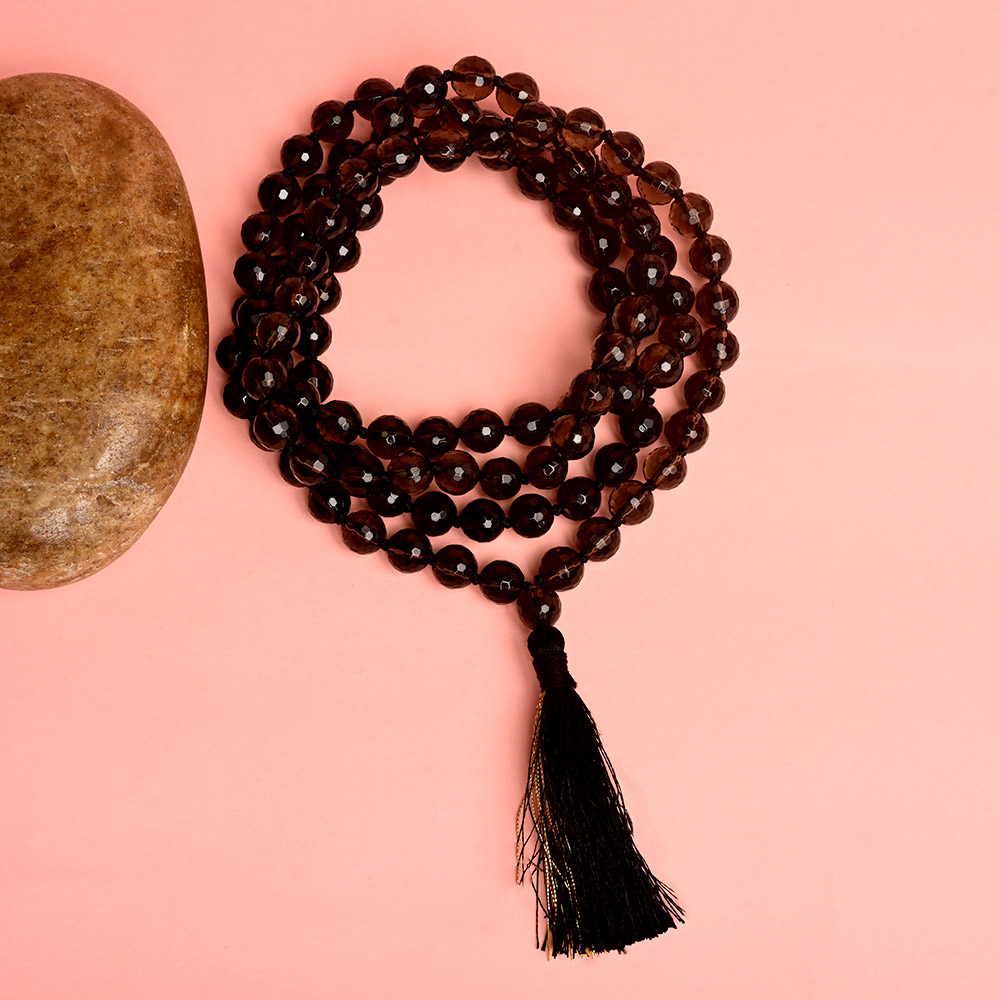 This mala features faceted Smoky Quartz beads, each with an intricate cut that enhances the stone’s natural energy. The beads are strung together with knots between the beads and a black and gold tassel.