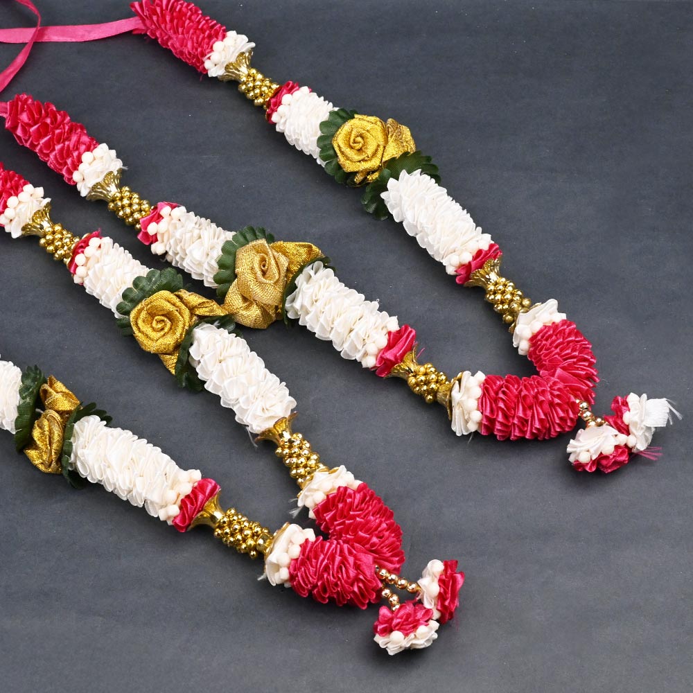 This set includes two deity garlands made with segments of white faux flowers, bright red faux roses, and shiny golden fabric roses, interspaced with green leaves and golden beaded separators; the design is traditional yet durable, and each garland is tied with a sturdy white thread for easy placement on idols or frames.