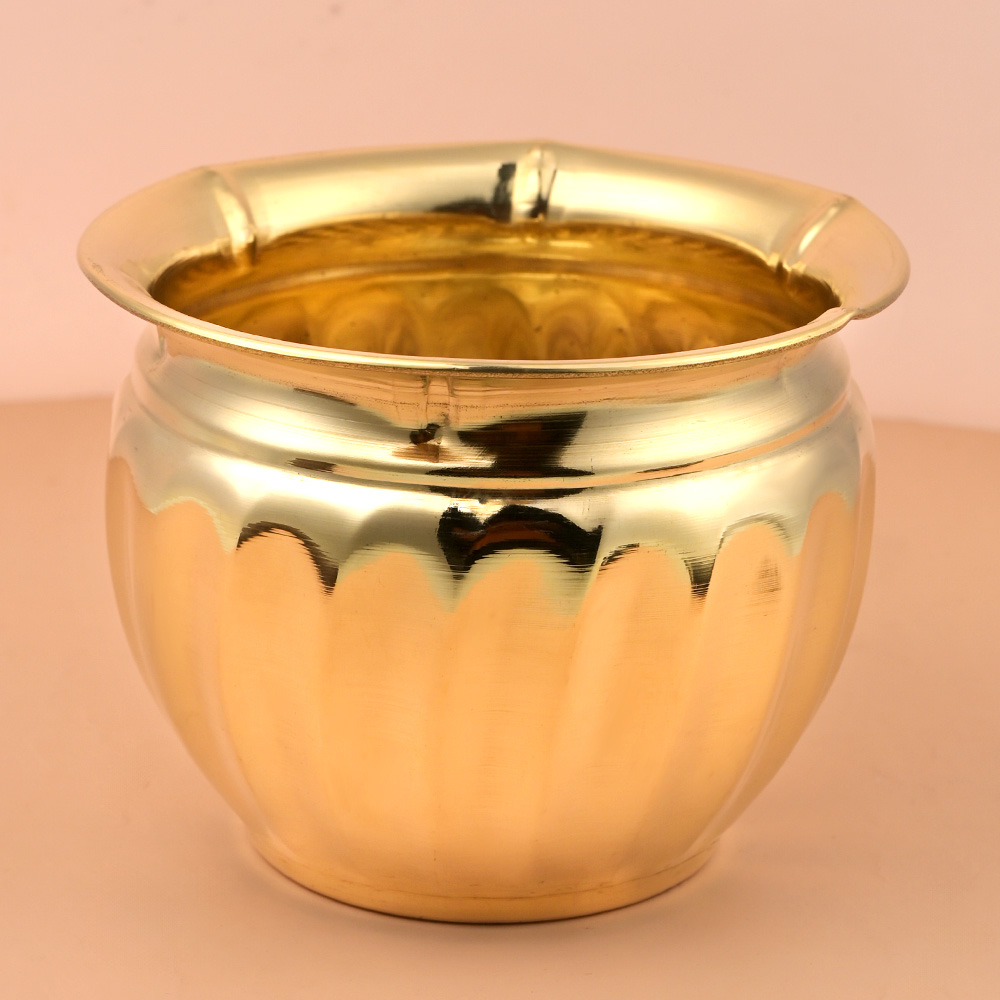A lovely, shining Flower Container carved from Brass, is perfect for keeping fresh flowers, leaves for offering while performing Puja rituals or for simply keeping it your Puja Mandir/room filled with beautiful Flowers as an offering to the Divine Deities. The container is deep and can hold enough flowers for your Puja, Pushpanjali and can be also used for keeping flowers for decoration purpose, like, grihapravesh, wedding ceremony etc. Traditionally, offerings to Gods are decorated and displayed beautifully and neatly, as it shows our love and respect for Divine.