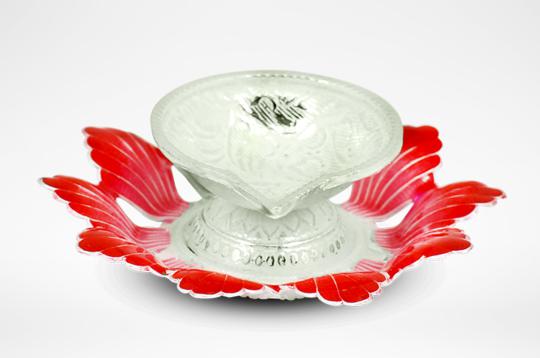 Crafted in pure silver, this Diya beholds the attention of one and all, because of its magnificent make. The inner as well as the outer walls of this diya has fine engraved designs while the red colored flower petals made in pure silver form the base of it. Its size and shape makes it suitable for all alter sizes. The Hibiscus flower is known to attract the principle of deity Ganesh. Hence, the base of this diya is designed in the shape of the Hibiscus flower. Pure silver is considered very sacred and connects well with earth element. Its size and structure makes it perfect to be just in small puja alters. If you love investing in unique products than, this diya is sure to add to your collections.