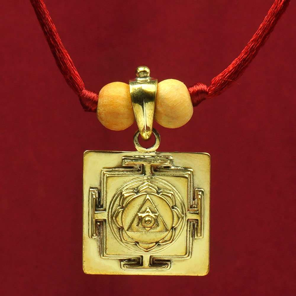 This pendant showcases a finely crafted 3D Ganesh Yantra in solid brass, featuring a central triangle with a bindu encircled by lotus petals and square yantra borders, symbolizing divine energy and protection. The pendant is attached to a red cotton thread and is flanked by two smooth, light-colored wooden beads that add a natural, spiritual touch to the design. Its compact square form and radiant brass finish make it ideal for wearing close to the heart during prayer, meditation, or daily spiritual practice.