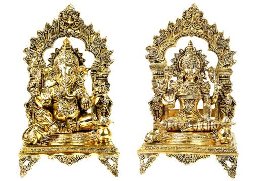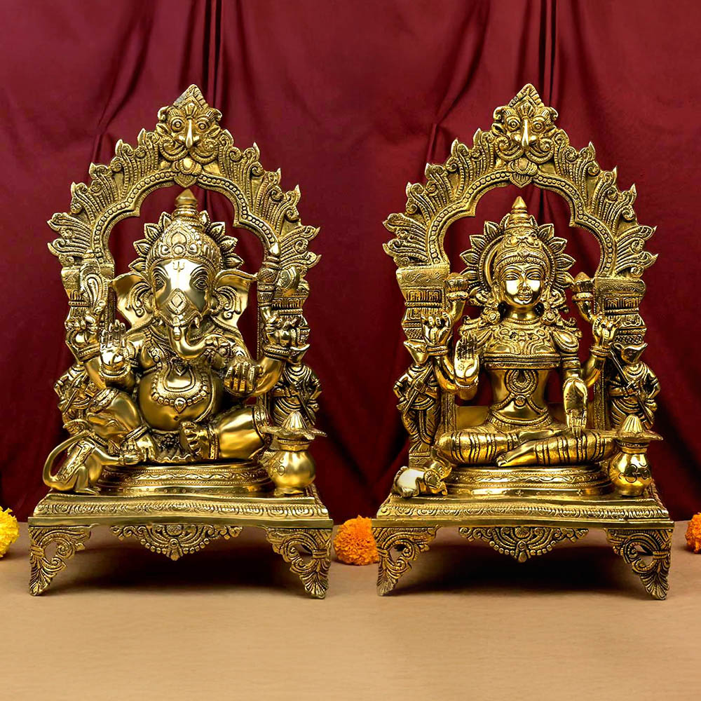 Immerse your space in magnificent splendor and profound blessings with this Ganesh Laxmi Idol set in brass, each deity rising to an extraordinary 17.5 inches in height. Every element of this ensemble speaks to the pinnacle of sacred art, Ganesh and Laxmi are masterfully crafted with imposing presence, seated atop lavish lotus pedestals and set against ornately carved backdrops that exude sophistication and spiritual vibrance. The gleaming brass finish, meticulously polished, brings life to the intricate jewelry, regal attire, and every delicate facial feature, making each glance a discovery in artistry.