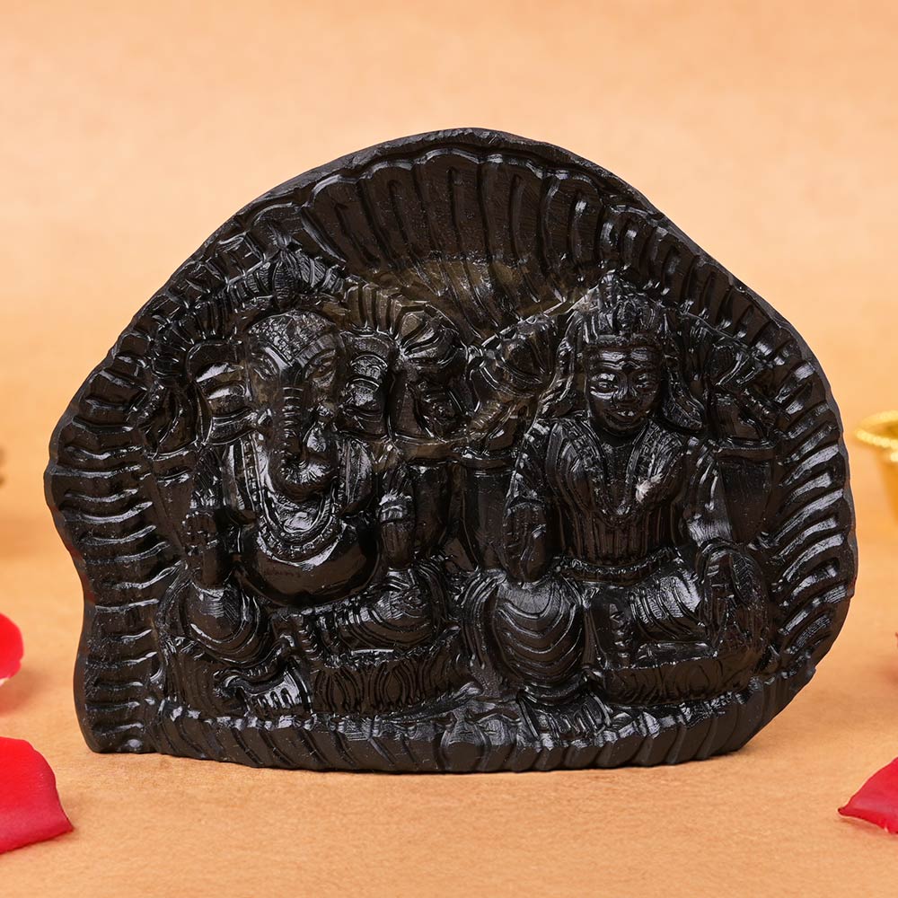 This divine idol features carving of Lord Ganesha and Goddess Laxmi on the sacred stone of Shaligram. Both Deities are portrayed seated on Lotus in Lalitasana pose with Their right hand raised in blessing pose. Lord Ganesha holds weapons in His upper arms in His left hand palm holds a sweet signifying sweet fruits of devotion in form of liberation. Goddess Laxmi with each of Her upper arm holding Lotus flower signifies spiritual practice and enlightenment. Her left hand in Varad mudra with coins flowing from it signifies blessings of opulence and riches. The fine carving illustrates the clothing and jewels of the Deities. The back of the stone has natural spiral pattern. Due to natural black colour, the idol looks exotic and divine. Goddess Laxmi and Lord Ganesha are worshipped together for blessings of abundance, fortune and success in all endeavors. Shaligram adds to the divinity of the idol, making the idol highly efficient in removing Vastu defects.