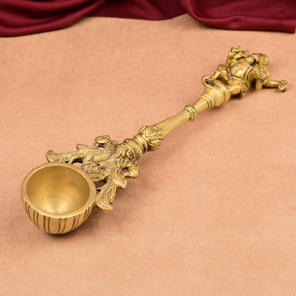 A beautifully antique designed spoon in Brass has Lord Ganesh in blessings position and two peacocks engraved on one end. This spoon is used for offering ghee and other sacred offerings during Homa / Havan.