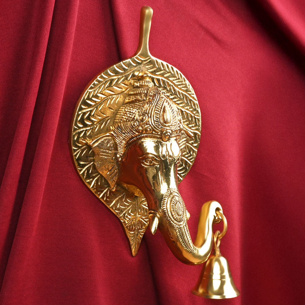 The incredible wall artifact of Lord Ganesha's Face in leaf with hanging bell is made in brass. This artifice can be hung on the entrance facing north. His crown and trunk has intricate designs.