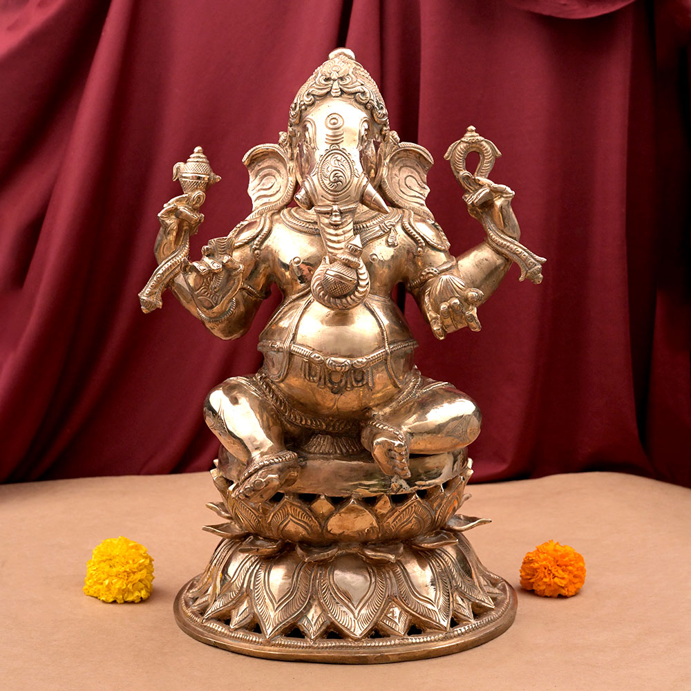 This idol of Goddess of creative arts, knowledge and learning, Maa Saraswati has been finely crafted in bronze. Seated on pedestal in lotus design and holding a rosary and playing the Veena while holding Vedas in Her other hands, the divine idol is an iconic piece of art. Each aspect including the fine drapes of the sari, detailing of jewels and physical attributes crafted in a realistic manner has been brilliantly carved to perfection by the artisan. Reflecting the rich art form of South of India, the majestic idol is ideal to be kept in your living area or educational or art institute. It also makes an ideal gifting idea for a student or artist, keen to learn and grow.