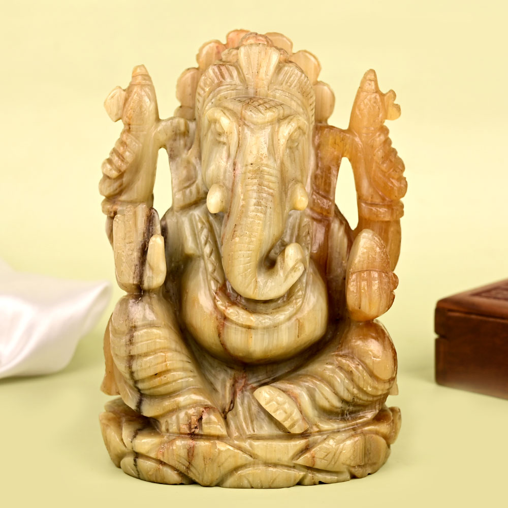 The Chaturbhuj (four-armed) Ganesha idol in a seated posture is crafted from natural Cats eye gemstone to confer combined benefits of Shri Ganesh and gemstone. Holding an axe signifying detachment and Goad signifying guidance in both the upper arms and sweet in lower left palm signifying Moksha (spiritual liberation), this majestic idol of Lord Ganesh is ideal to place on alter, in the living area, office space or near the entrance. Seated on a dais with rocky terrain like carving, the carving featuring folds of Dhoti, neat physical attributes and design on the crown is a reflection of skilled craftmanship. Cats Eye discharging the positive energies of planet Ketu and Ganesh being the worshipped deity to pacify malefic effect of this planet makes this idol is highly beneficial for those afflicted by Ketu planet. Worshipping this idol confers peace, harmony, spiritual enlightenment, luck, wit, intelligence, knowledge and quick learning.
