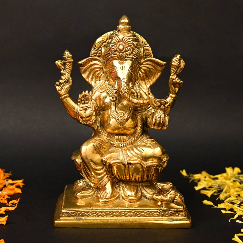 In this Idol, Ganesha exquisitely portrayed in heavy shining brass.
