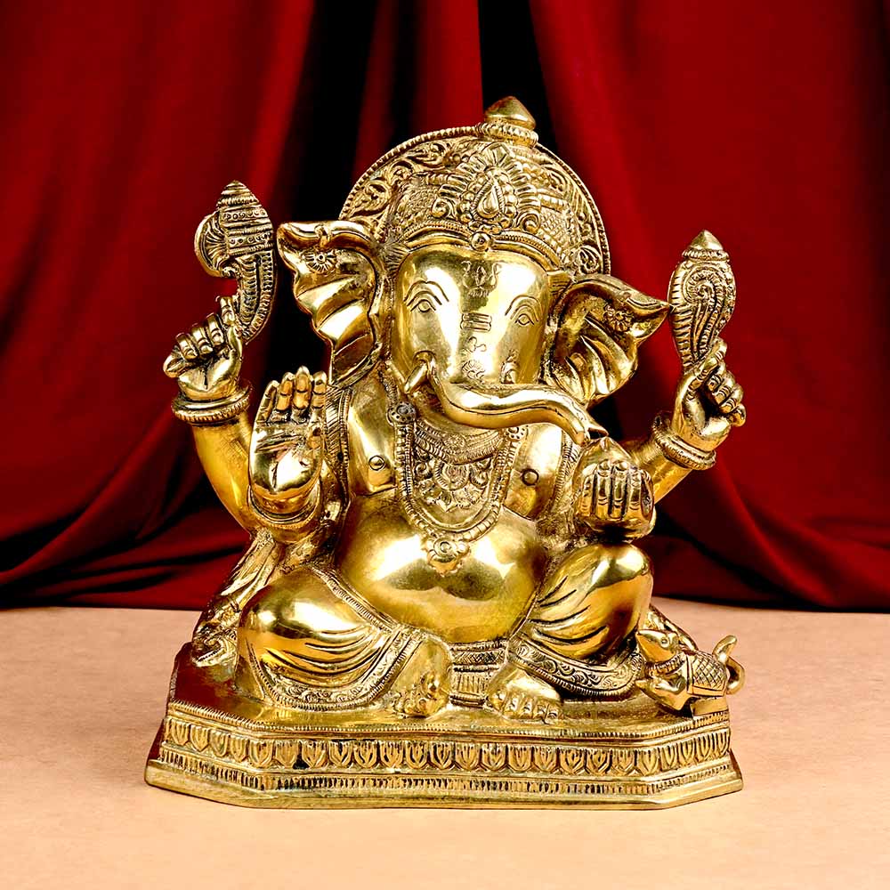 A majestic idol of Lord Ganesha engraved minutely in shining brass. He holds Modak in one hand and blesses with the other. In the other 2 hands, he holds an ankush and a bow. Lord Ganesha rules your Root Chakra that removes obstacles to your career progress.