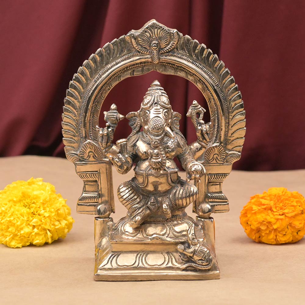 Fine Idol of Lord Ganesh is pure bronze. The Idol is carved finely by traditional artisans from South India. The most loved deity, Lord Ganesh is the first to be worshipped before beginning any endeavor. He is honored at entrance of home/offices and worshipped first in the altar.