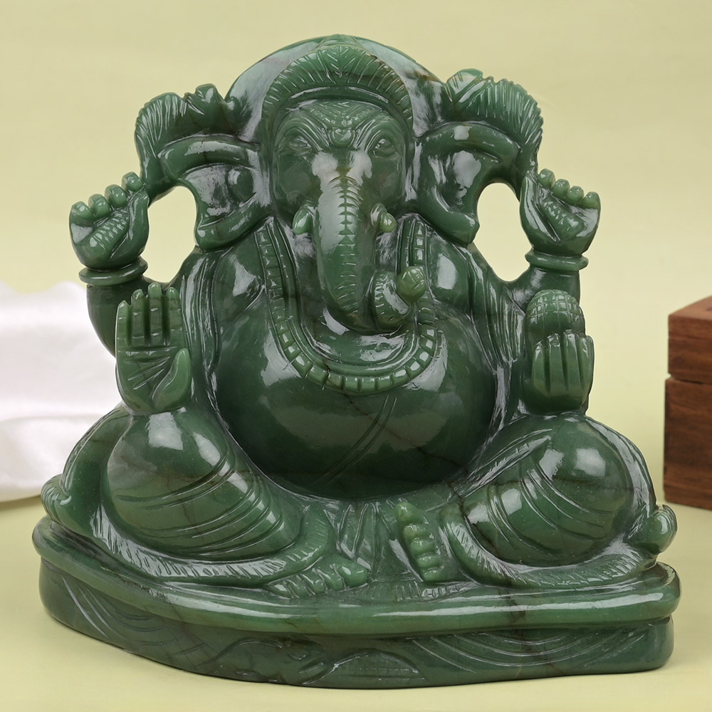 This beautiful Lord Ganesh Idol finely and artistically carved in 100% Natural Dark Green Budd stone. In this idol, Ganesha is raising His right hand in blessing pose and holding weapons in His upper hands, while His left palm holds a modak. The exquisiteness of the Idol lies in the fine carving work on the forehead, ornaments, palms and clothing. Lord Ganesha in Budd Stone stimulates the energy centres (chakras) and assists the movement of Kundalini. On emotional level this stone bring consistency, reliability, stability and fortitude and removes the subtle negative energies that clings to an individual and protects one from all evil, purifies mind and increases the flow of positive energy, thought and ensures success and glory to all. Place the divine Idol on the altar, work or study desk or near entrance of your dwelling or place of business for auspiciousness.