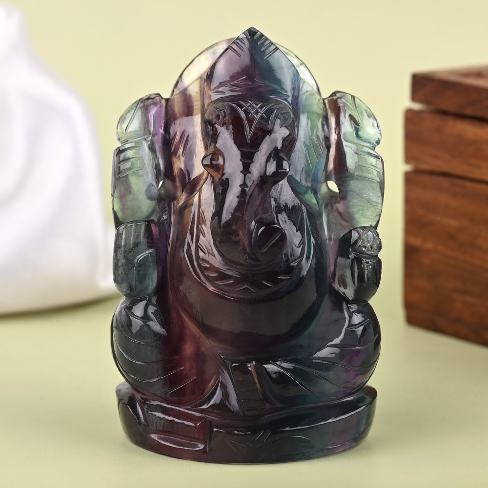 This divine idol of Lord Ganesha in enchanting purple tone is entirely created out of natural Fluorite gemstone which brings order from chaos. With dual benefits of deity blessings and gemstone properties, the Idol surely makes a great spiritual gift for your loved ones. Ideal to place in puja altar, living area or office desk or near entrance, the Idol looks blissful with its translucent sheen and meticulous craftsmanship. Fluorite gemstone promotes cleansing qualities of peace, purity, protection, awareness and focus.