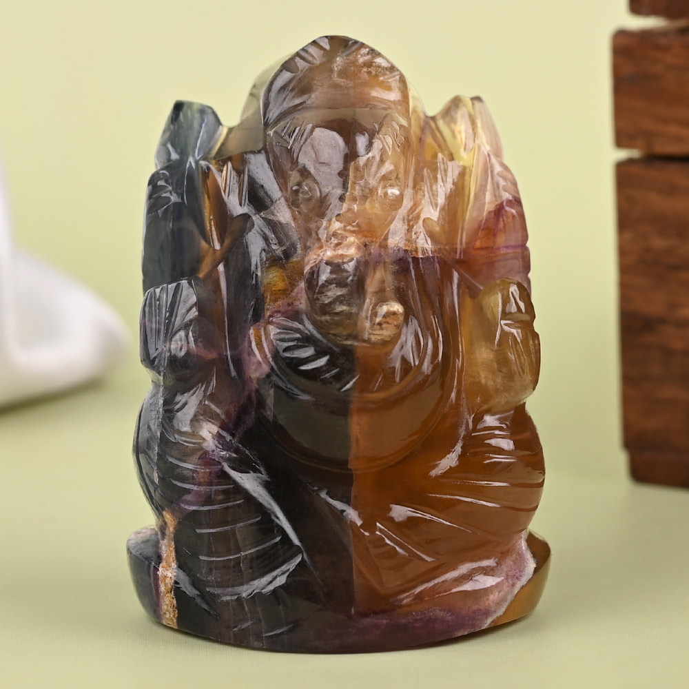In this Idol, He is beautifully carved in natural Flourite. FLUORITE brings order from chaos. It is the "stone of discernment and aptitude" that acts as a protective, psychic shield and auric cleanser. It also helps relationships and encourages and sustains the flawless ideal of health, intellect and emotional well-being.