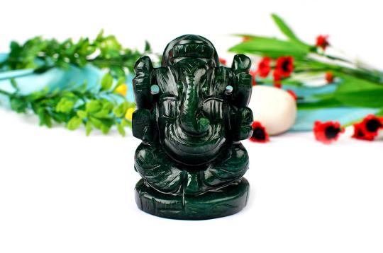 This admirable Lord Ganesha idol is carved finely from natural Green Aventurine Gemstone and can be kept in puja alter at your home or in office, etc. The idol portrays Lord Ganesha with His right lower hand raised in the Abhaya mudra, which assures of His protection, blessings, and guidance. In His lower right hand, He is holding a sweet. In His upper two arms, He is holding the noose, the axe, and the goad. This Ganesha in Green Aventurine brings auspiciousness and successful new beginnings.