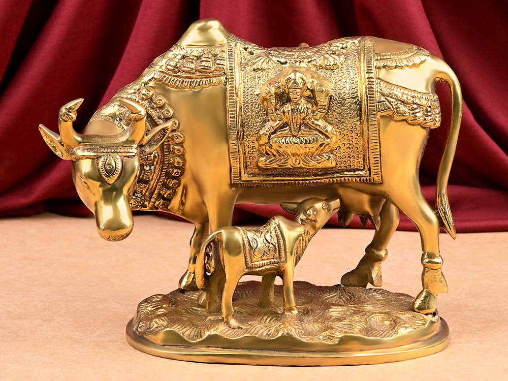 A magnificent idol of Gaumata with Calf, crafted skilfully from high quality, heavy Brass is desirable for every home/business or workplace. The Gaumata(cow) with Calf idol symbolizes auspiciousness and invites happiness, prosperity, peace, good luck, loving energies to the dwelling and is a significant Vastu artefact. Gaumata with Calf is also revered as Kamdhenu Gai(cow), who is a celestial wish fulfilling cow.