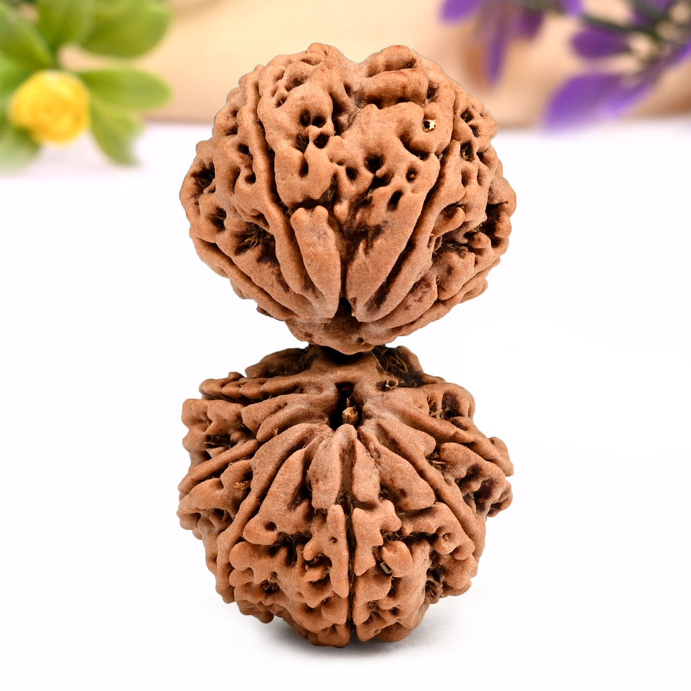 The Gauri Shankar bead is two naturally joined beads of same Mukhi which represent the unified form of Lord Shiva and Goddess Shakti/Gauri, representing the union of Divine masculine and feminine. The superior quality Gauri Shankar 11 Mukhi is best worn as a Locket for optimum benefits. The ruling Deity is Dakshnimurthy, which is a form of Lord Shiva as the Universal Guru (teacher). The Gauri Shankar 11 Mukhi helps to connect with Guru, one's higher self, provides the wisdom, knowledge and intellect to face the truth about one's own self. It is an excellent bead for improving self expression, communication, creativity and brings vital lessons from Guru Brihaspati/ planet Jupiter, the Guru(teacher) of Gods. The 11 Mukhi enriches the mind with true wisdom, knowledge and intellect, spiritual upliftment, will power, prosperity, helps to recognize one's limitless self and blesses with success.