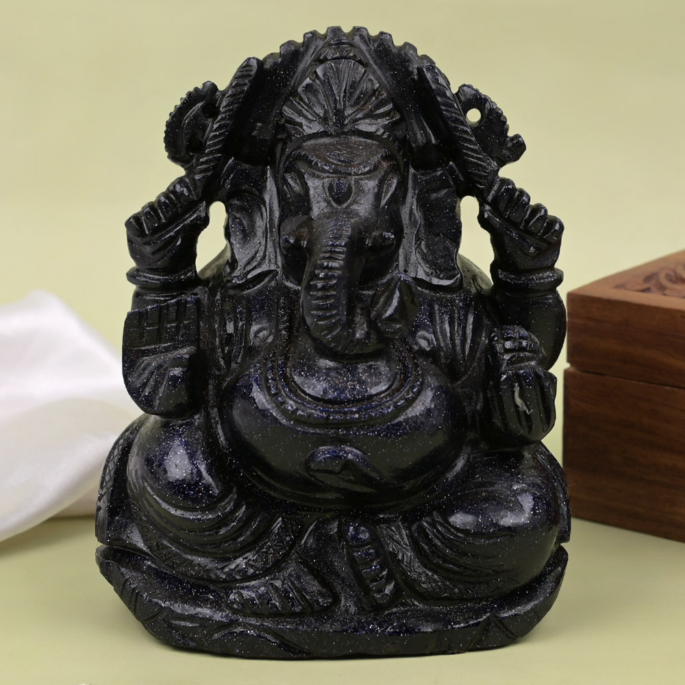 This idol of Lord Ganesh is entirely carved out of Sunstone dust, shimmering with silver specks all over its body. Sunstone carries the energy of Sun planet. It stands for independence and originality. Combination of Sunstone and Lord Ganesha serve as a divine fortune Idol.