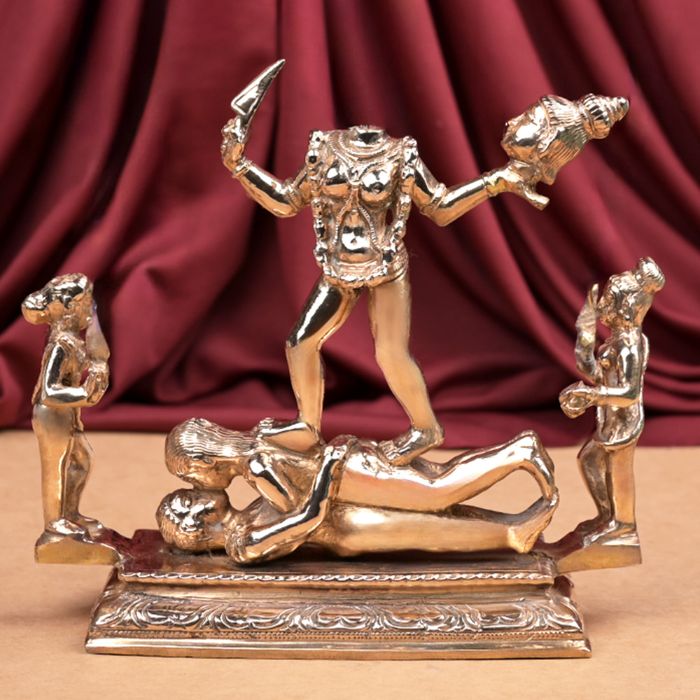 This rare idol in shining bronze portrays Goddess Chinnamasta, Who is one of ferocious aspect and forms of Dusmahavidyas (wisdom Goddess). In this idol, She is depicted holding Her own severed head in one hand and a sword in Her other hand symbolising Her self-sacrifice for welfare of the world. She is adorning a garland of skulls, while Her companions – Dakini and Varnini are seen on standing on Her either side, holding a sword and bowl In their hands. Chinnamasta Devi stands on bodies of God of love, Kama and His consort Rati who are in sexual embrace, which signifies sexual self-control of Devi. Devi severed Her own head and blood flew out of her decapitated body in three jets and the central jet flew into her own head and the other two jets of blood streamed into Her companions mouth, symbolizing Her as a nourisher of the universe. Symbolically, Goddess personifies the bliss and power of transformation in action. Goddess Chinnamasta is worshipped for removal of poverty, obstacles and troubles and for overcoming limitation of mind and also for enhanced perception. This magnificent Idol can be placed on the Home/Office table or Puja altar.