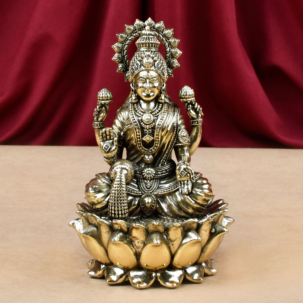 This radiant Goddess Lakshmi Ashtadhatu Idol depicts Mahalakshmi seated gracefully on a fully bloomed lotus, symbolizing purity, fortune, and spiritual power. With four hands representing Dharma, Artha, Kama, and Moksha, she holds lotus flowers and displays the Abhaya and Varada Mudras—blessing devotees with protection and prosperity.