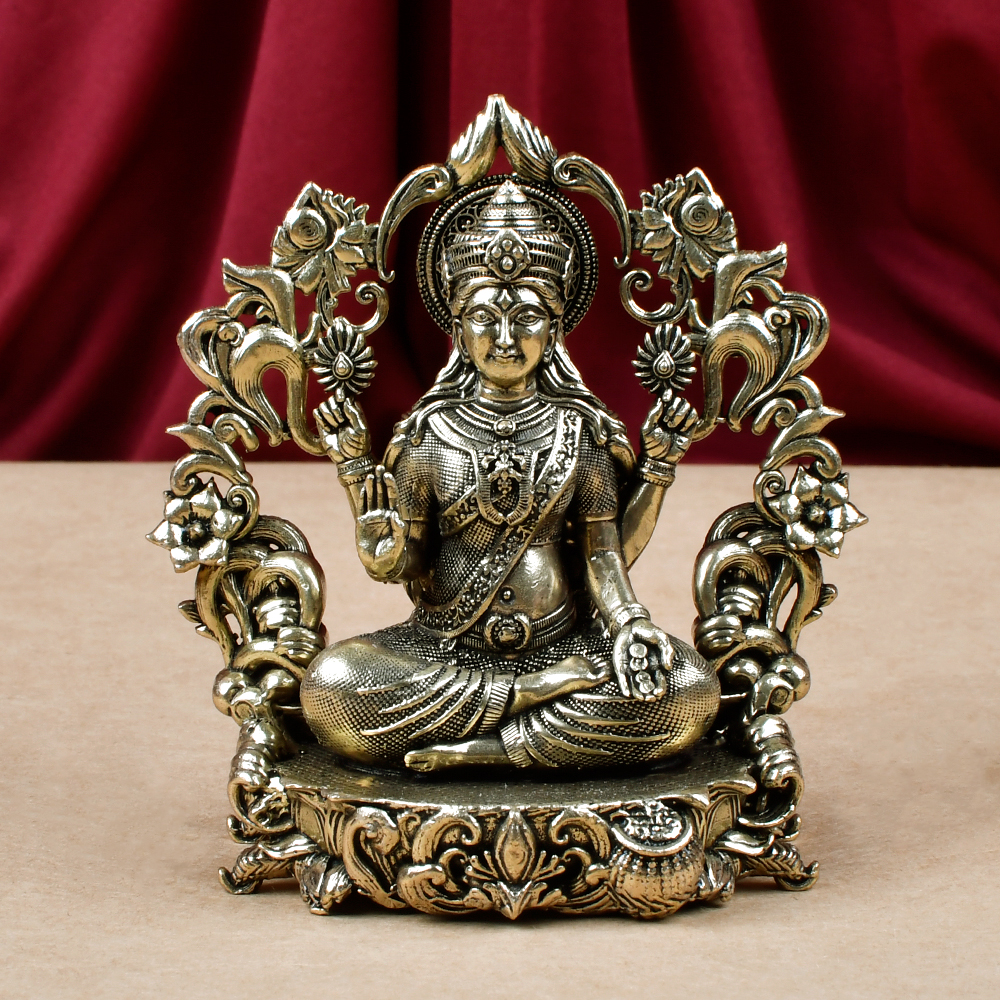 This intricately crafted Goddess Lakshmi with Floral Frame Ashtadhatu Idol features Mahalakshmi seated gracefully on a lotus pedestal, framed by a blooming arch of ornate floral carvings that symbolize abundance, beauty, and divine grace. With her four arms holding lotus flowers and coins, and her hand in the varada mudra, the idol radiates prosperity, purity, and blessings.