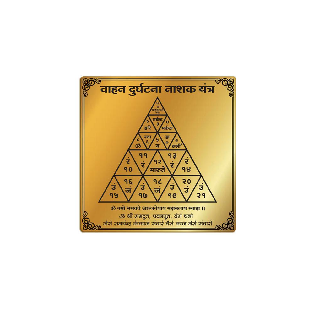 This powerful Vahan Durghatna Nashak Yantra sticker is crafted on a premium golden acrylic plate, featuring a precisely etched triangular sacred diagram composed of protective numeric and beej symbol grids. Its glossy gold finish gives it a refined, auspicious look, while the deep black engravings ensure clarity and durability over time. Compact, elegant, and easy to place, it can be applied on cars, bikes, helmets, dashboards, doors, laptops, bags, or workspaces for constant divine protection. The fine detailing and traditional border work add to its spiritual charm, making it both a protective amulet and a visually appealing accessory.