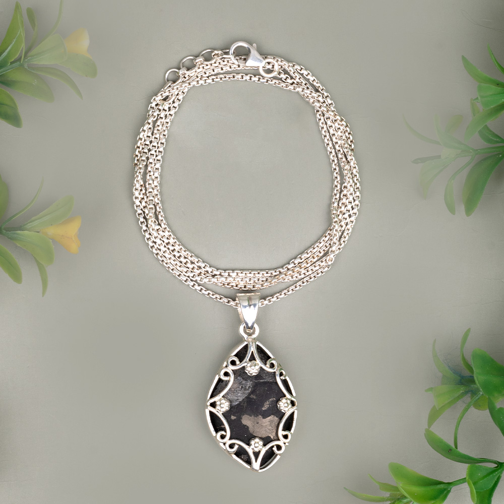 This leaf-shaped pendant holds a naturally powerful Golden Shivnetra Shaligram, enshrined in a finely sculpted 925 sterling silver frame. The black stone from Gandaki river in Nepal displays golden streaks that resemble the sacred third eye (Netra) of Bhagwan Shiva. The frame is decorated with symmetrical swirls and tiny floral domes, enhancing the aura of mysticism and divine vigilance. It is suspended on a polished multi-strand silver chain with a sturdy lobster clasp, allowing it to rest gracefully near the heart.
