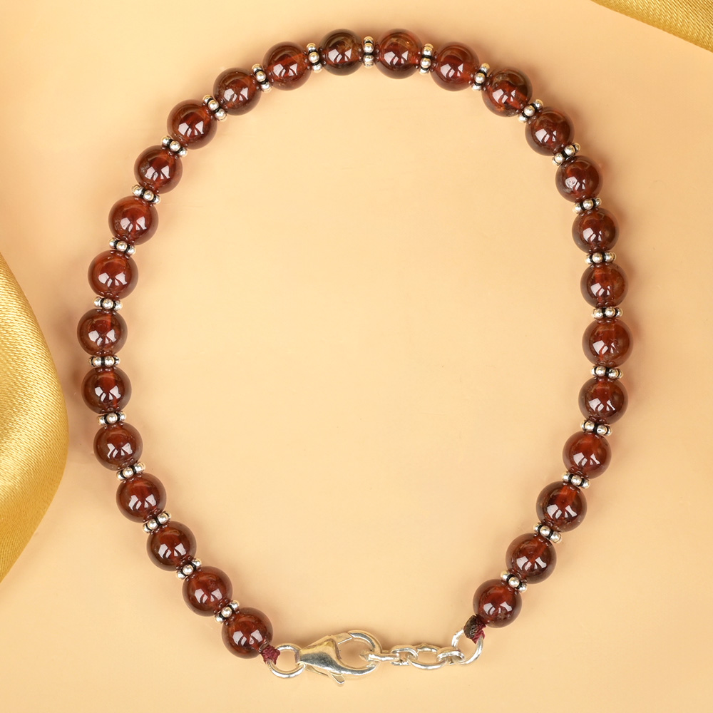 This Gomed 925 Silver Chakri Bracelet features rich honey-brown natural hessonite beads, each polished to a smooth, glossy finish. The bracelet is accentuated with delicate 925 silver chakri spacers that add a subtle shine and refined detailing between every bead. Strung with precision and finished with a sturdy sterling silver clasp, it has a clean, premium, and sophisticated look-perfect for both daily wear and special occasions.