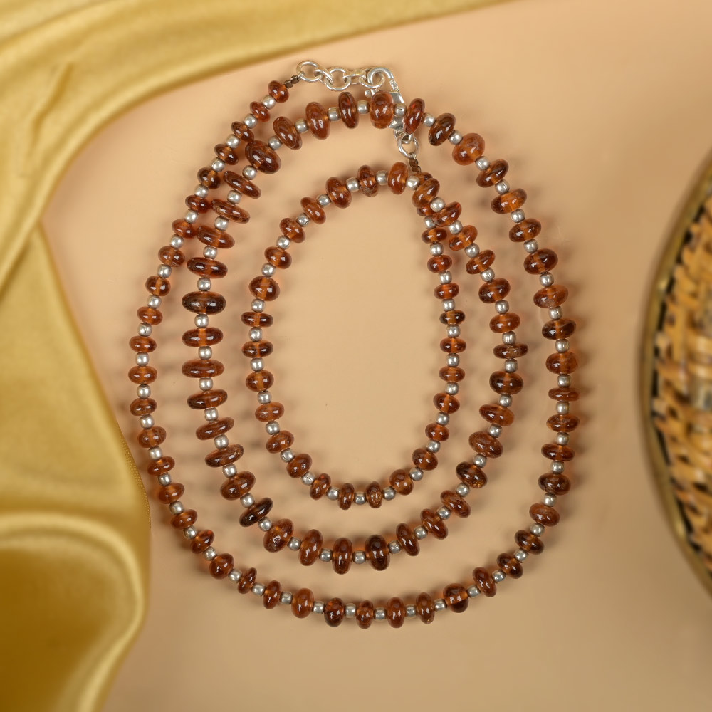 This Gomed Button Shape Beads 925 Silver Balls Necklace is beautifully crafted with smooth, polished hessonite garnet button beads arranged in warm shades of amber, honey, and deep brown. Each bead reflects a glossy, natural radiance, complemented perfectly by the addition of premium 925 silver balls that add brightness, contrast, and an elegant finish to the entire design. The necklace is finely strung with a secure silver clasp, offering a refined and luxurious aesthetic suitable for both daily wear and special occasions.