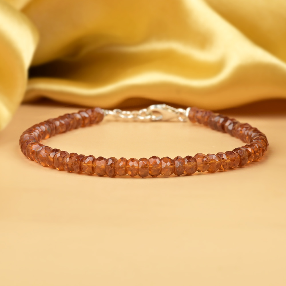 This Gomed Faceted Button Beads Bracelet is crafted from natural hessonite gemstones, shaped into sparkling button-cut beads that beautifully catch and reflect light. Each bead displays rich honey–amber to deep cinnamon tones, giving the bracelet a warm, radiant appearance. The faceted finish adds a touch of elegance, while the secure clasp ensures a comfortable and adjustable fit. Its refined, minimalist design makes it suitable for both daily wear and occasional styling.