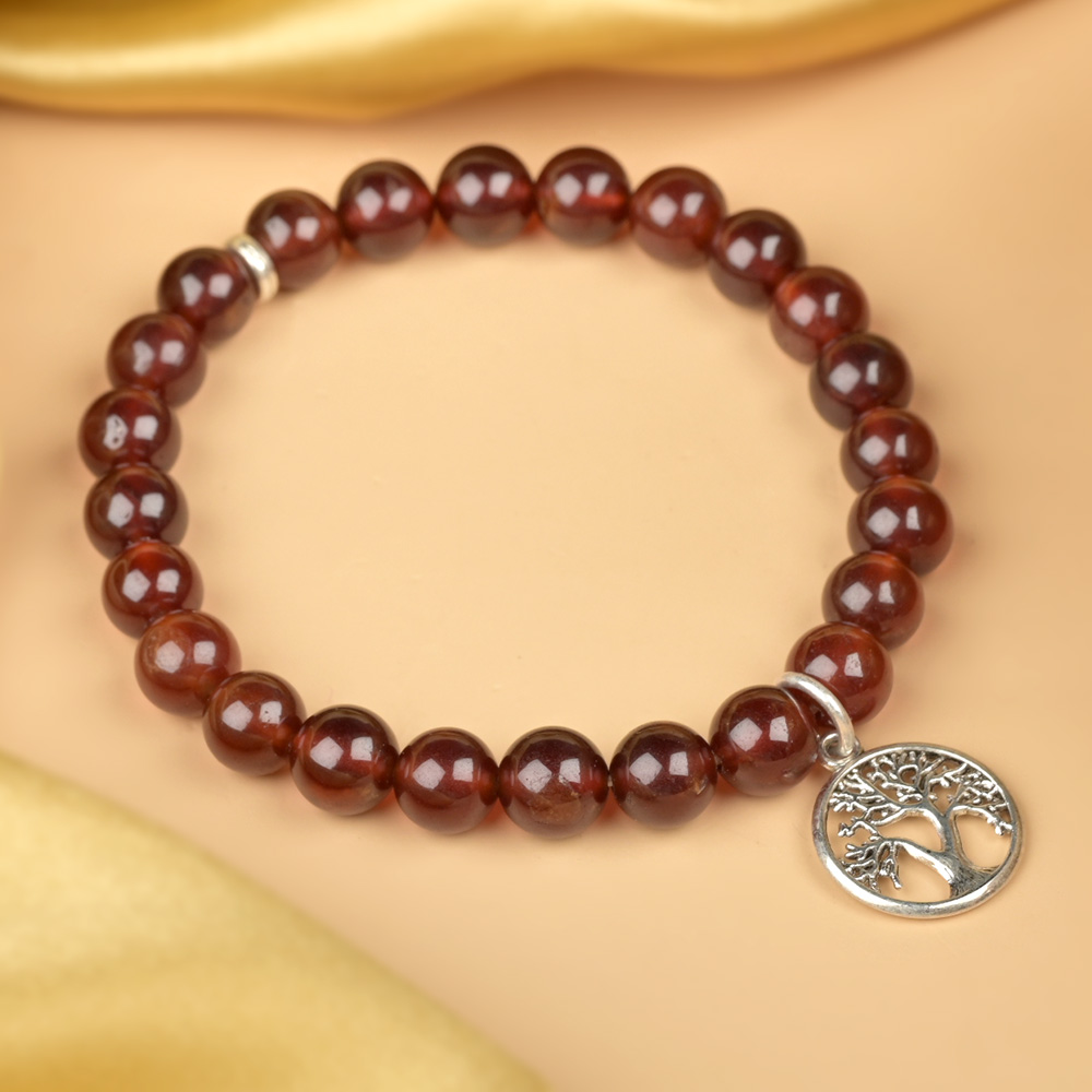 This Gomed Hessonite Tree of Life Bracelet features deep amber-brown hessonite beads, each polished to a smooth, glossy finish that highlights their natural translucence and richness. The bracelet is accented with a sleek metallic spacer and a beautifully detailed Tree of Life charm in silver tone, adding a symbolic and elegant touch. The combination of earthy gemstone tones with the intricate charm makes this bracelet visually striking yet refined, perfect for daily wear or meaningful gifting.